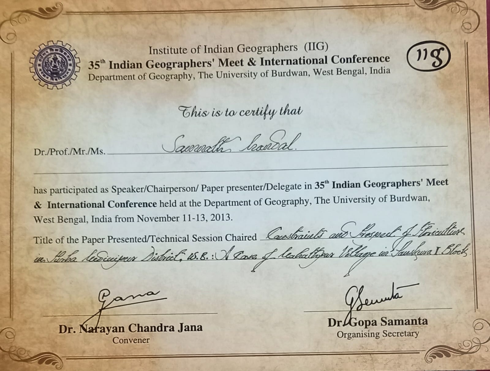 2013-11-11 | 35th Indian Geographer’s Meet & International Conference | International | Constraints and Prospects of Floriculture in Purba Medinipur District, WB: A case of Mahatpur Village in Panskura-I Block. | DOWNLOAD | 2013-11-11 |