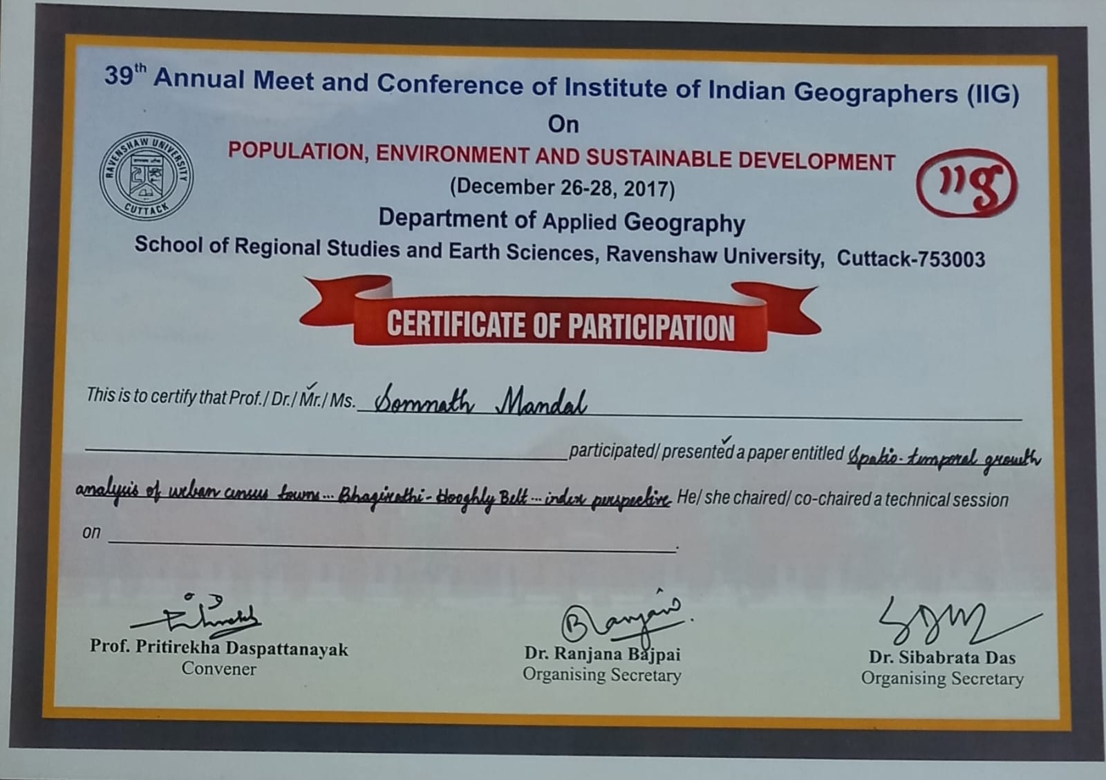 2017-12-26 | 39th Annual Meet and Conference of Institute of Indian Geographers | National | Spatiotemporal growth analysis of urban census towns in Bhagirathi- Hooghly Belt: A Urbanity index perspectives | DOWNLOAD | 2017-12-27 |