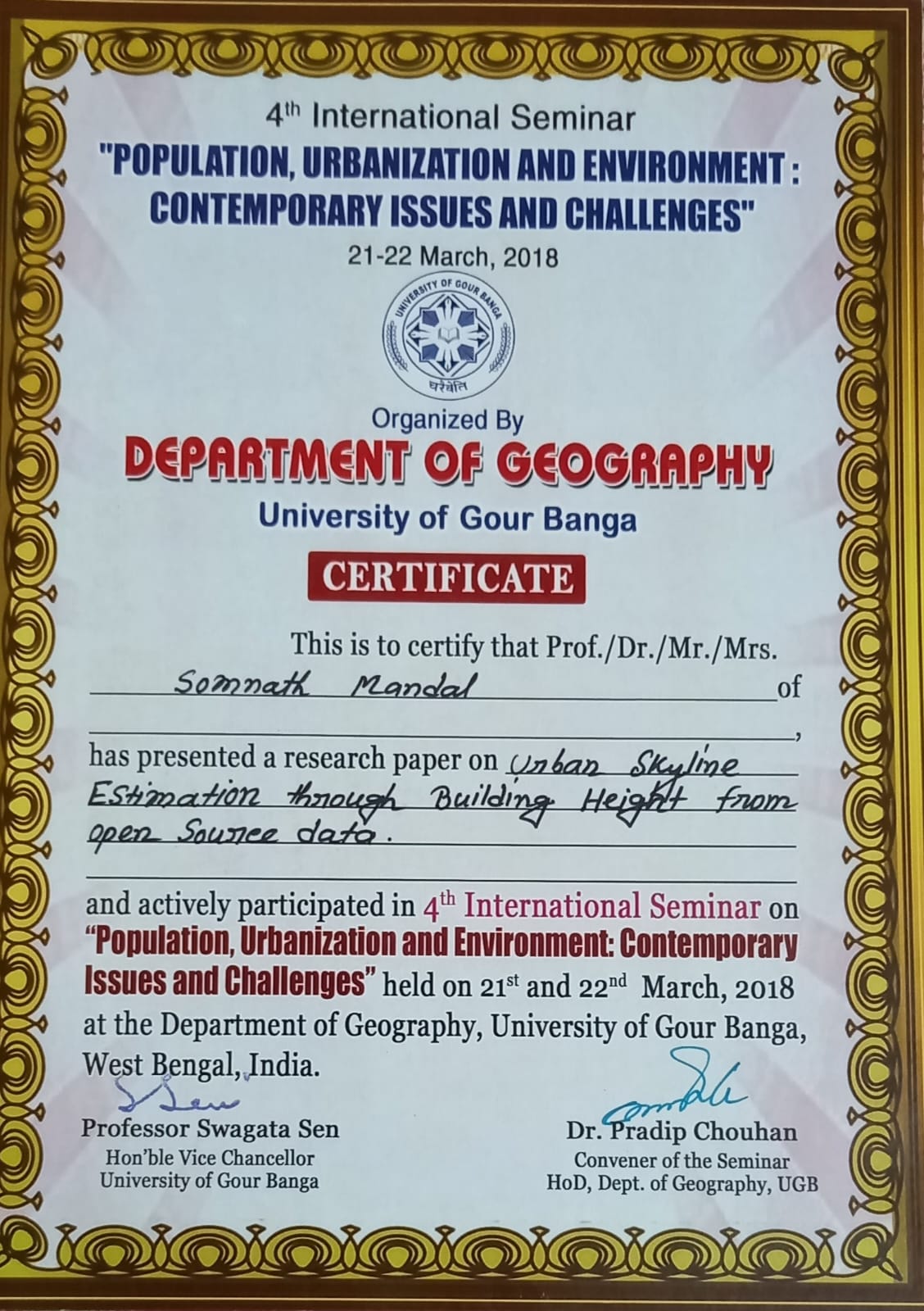 2018-03-21 | 4th International Seminar on Population, Urbanization and Environment: Contemporary Issues and Challenges | International | Urban Skyline Estimation through Building Height from open source data | DOWNLOAD | 2018-03-21 |