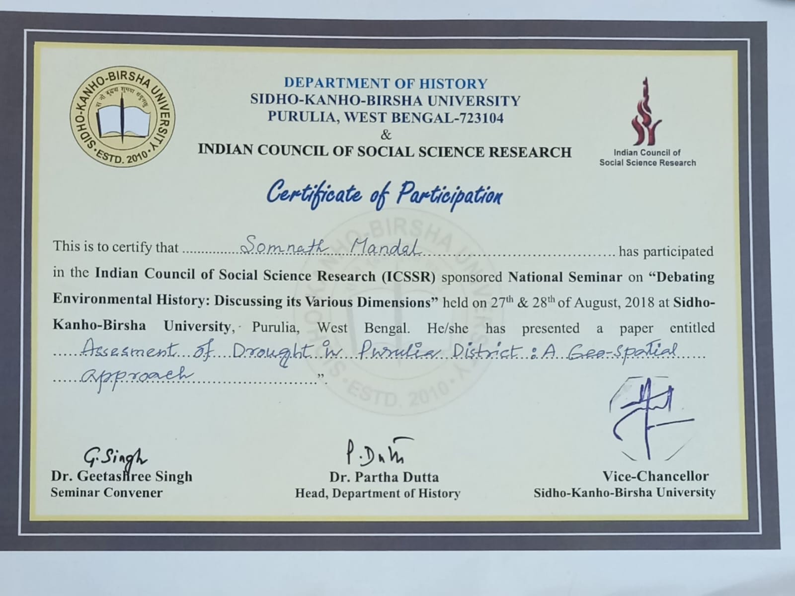 2018-08-27 | Indian Council of Social Science Research (ICCSR) sponsored National Seminar on Debating Environmental History: Discussing its various Dimensions | National | Assessment of Drought in Purulia District: A Geo-spatial approach | DOWNLOAD | 2018-08-27 |