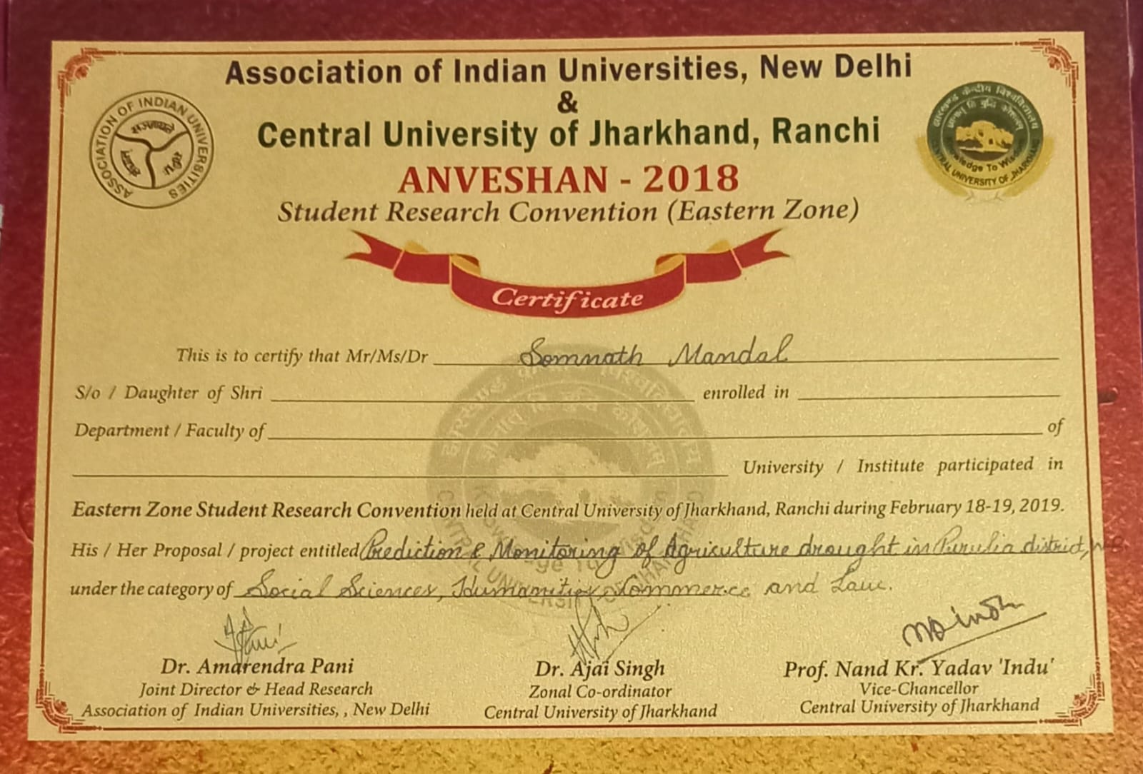 2019-02-18 | ANVESHAN-2018, Eastern Zone Student Research Convention | National | Prediction & Monitoring of Agricultural Drought in Purulia District, W.B | DOWNLOAD | 2019-02-19 |