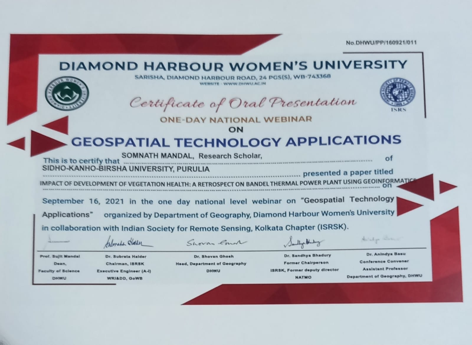 2021-09-16 | One Day National Webinar on Geospatial Technology Application | National | Impact of Development of Vegetation Health: A retrospect on Bandel Thermal power Plant (BTPS) using geoinformatics | DOWNLOAD | 2021-09-16 |