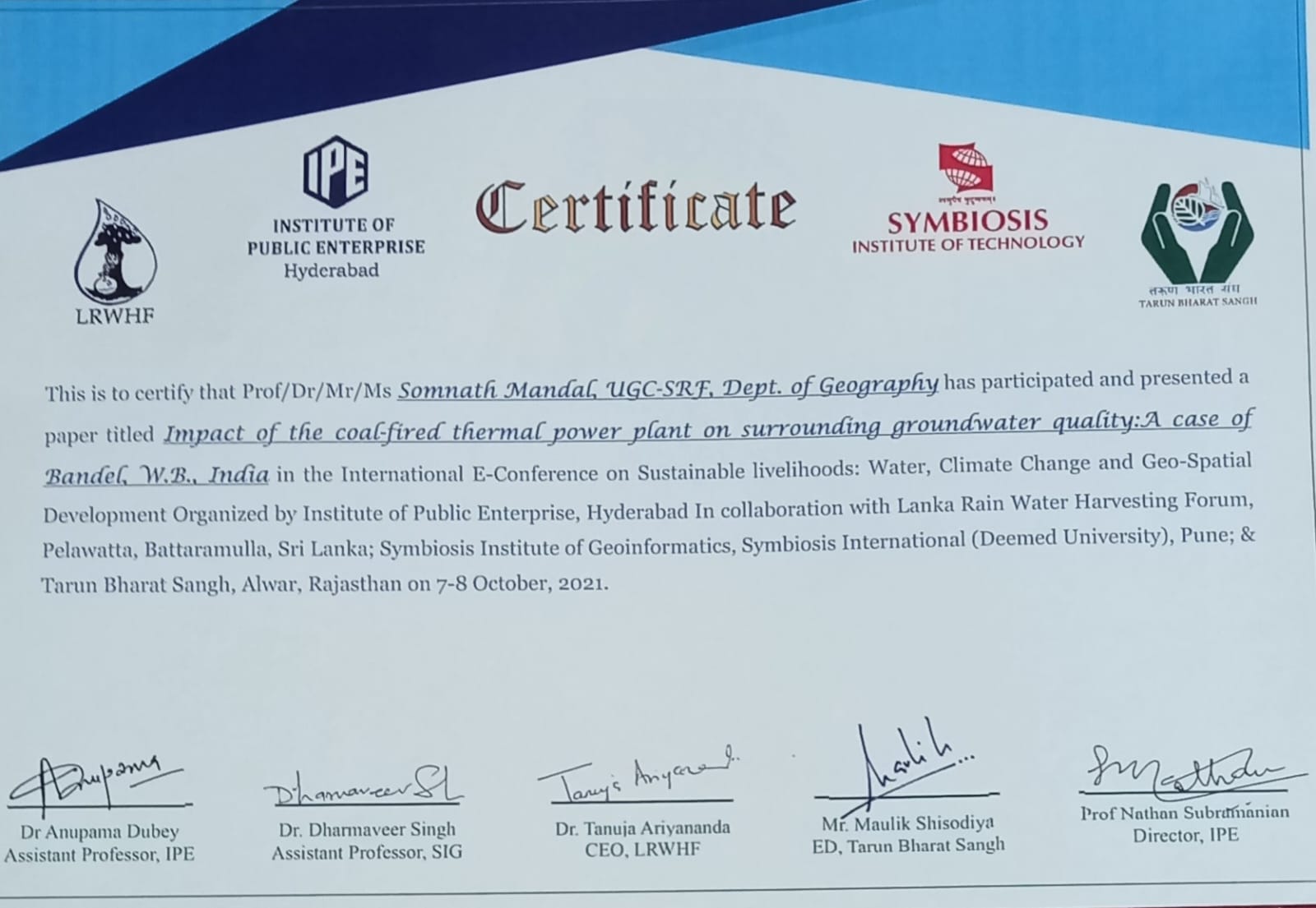 2021-10-07 | International E-Conference on Sustainability livelihoods: Water, Climate change and Geospatial Development | International | Impact of Coal-fired thermal power plant on surrounding groundwater quality: A Case of Bandel, W.B., India | DOWNLOAD | 2021-10-08 |