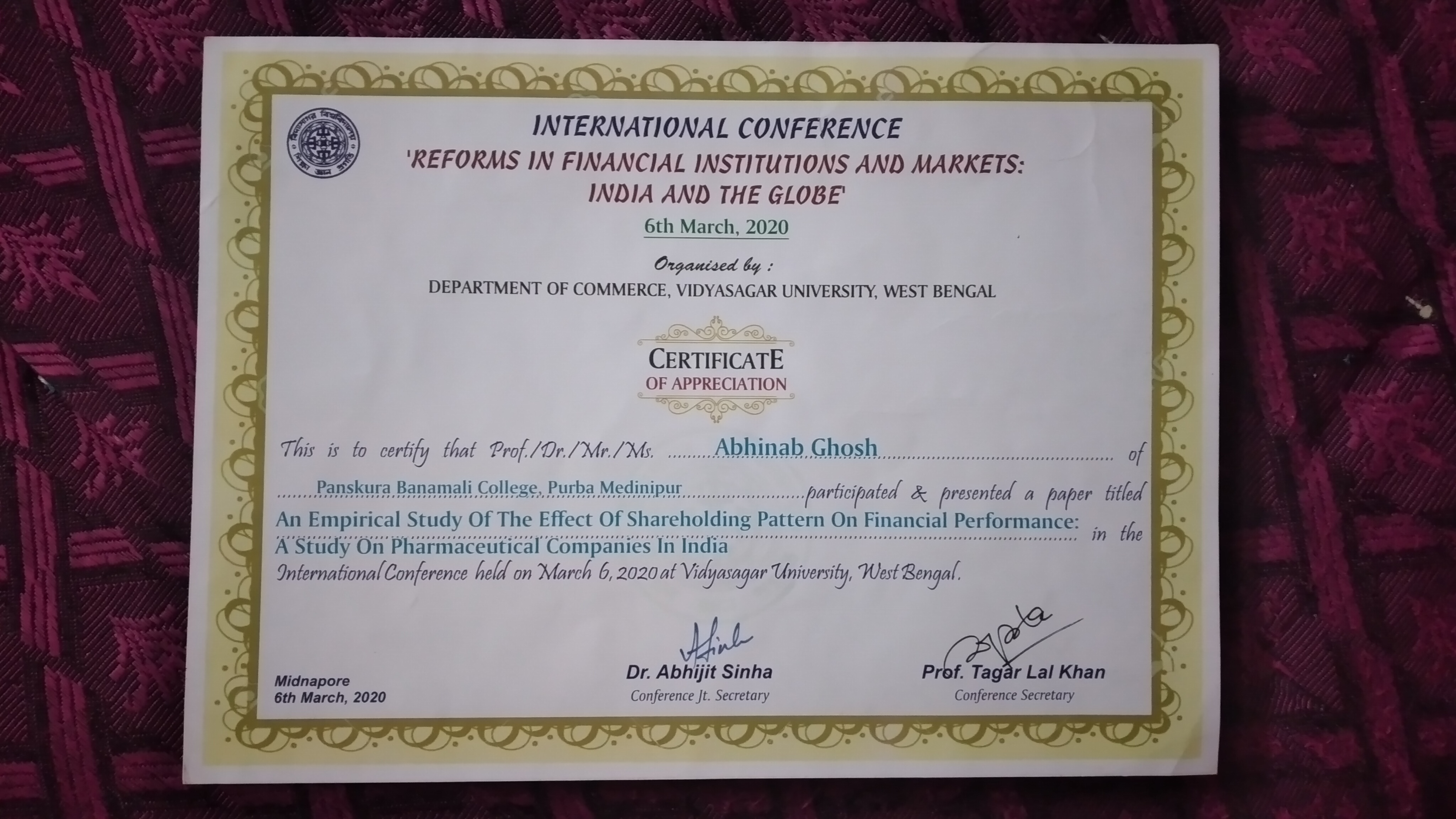 | 2020-03-06 | INTERNATIONAL  CONFERENCE ON “REFORMS IN FINANCIAL INSTITUTIONS AND MARKETS: INDIA AND GLOBE”  | International | AN EMPIRICAL STUDY OF THE EFFECTS OF SHAREHOLDING PATTERN ON FINANCIAL PERFORMANCE:  A STUDY ON PHARMACEUTICAL COMPANIES IN INDIA.  |  DOWNLOAD | 2020-03-06 |