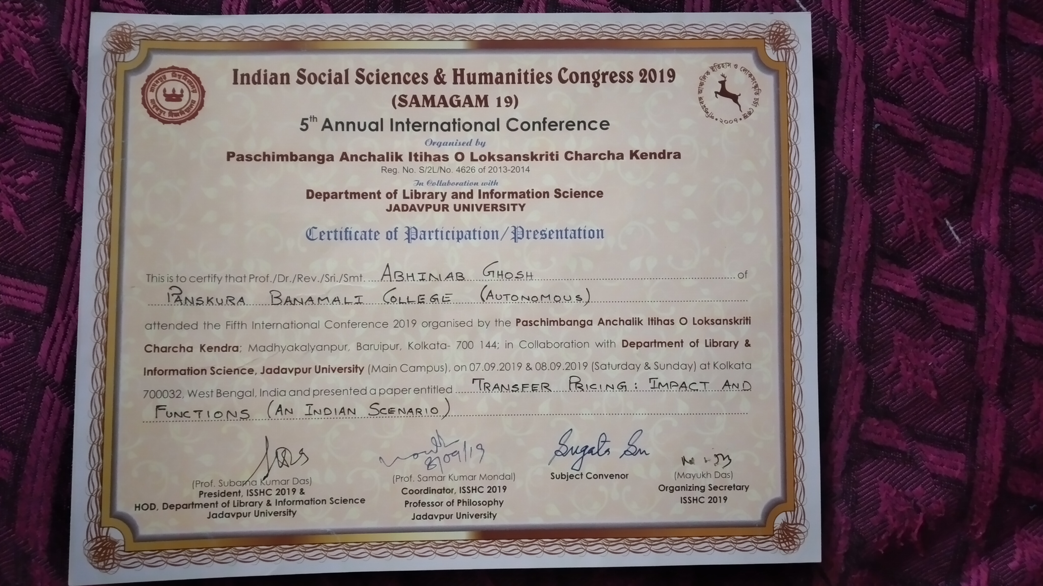 | 2019-09-07 | 5th Annual  International Conference of Indian Social Science and Humanities Congress | International | Transfer Pricing: Impact and Functions, an Indian Scenario. |  DOWNLOAD | 2019-09-08 |