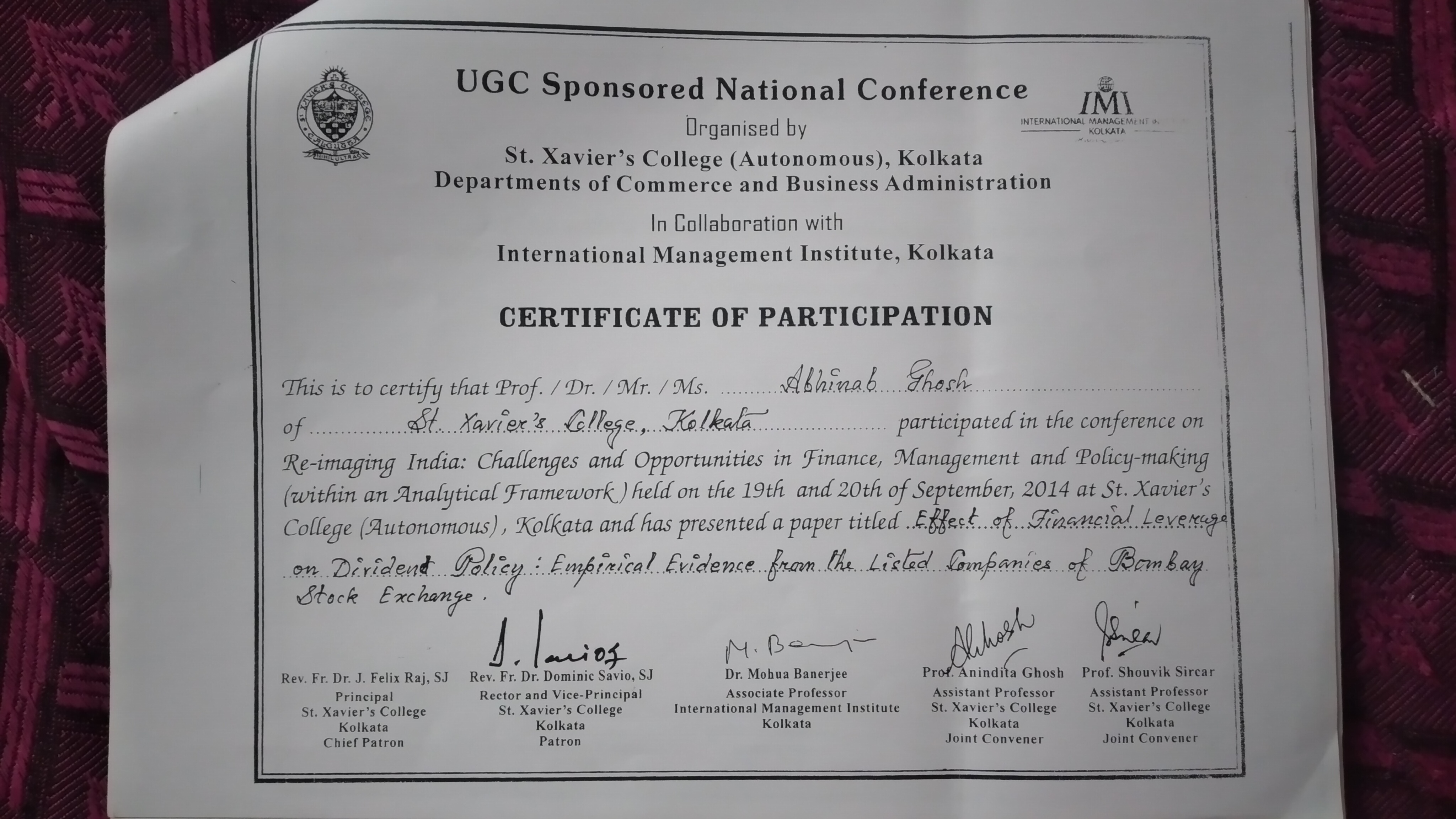 | 2014-09-20 | UGC Sponsored National Conference  | National | Dividend Policy : Empirical Evidence from the Listed Companies of Bombay Stock Exchange |  DOWNLOAD | 2014-09-20 |